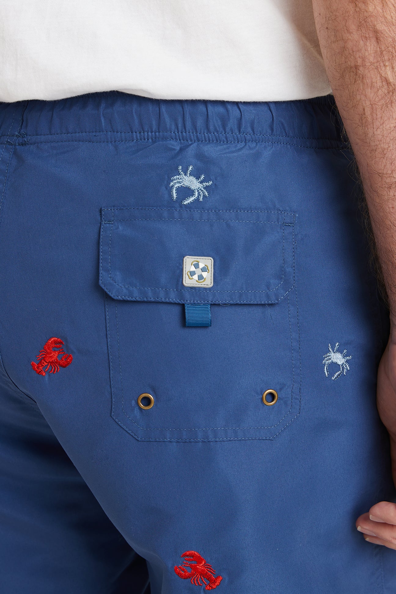 Dive into island style with our Sandbar Swim Suit, featuring playful lobster and crab embroideries on classic Nantucket navy. Whether you're splashing in the waves or transitioning from sand to your favorite waterfront bar, this versatile suit keeps you looking effortlessly cool.
