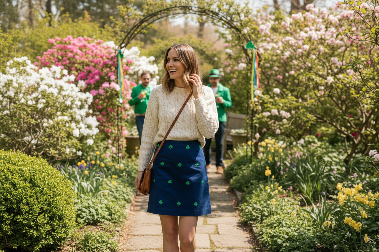 A skirt Perfect for the Irish and St. Patrick's Day! Our ladies stretch navy twill with Kelly green shamrock skirt is a real crowd-pleaser.