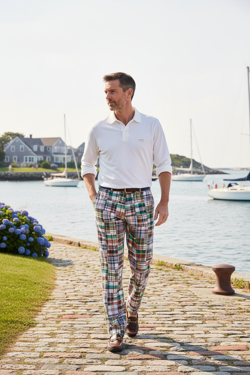 Our Harbor Pant Osterville Patch Madras are the perfect combination of timeless style and Cape Cod charm! We teamed up with our master shirt maker in Madras, India to offer you authentic, all cotton Indian madras pants.